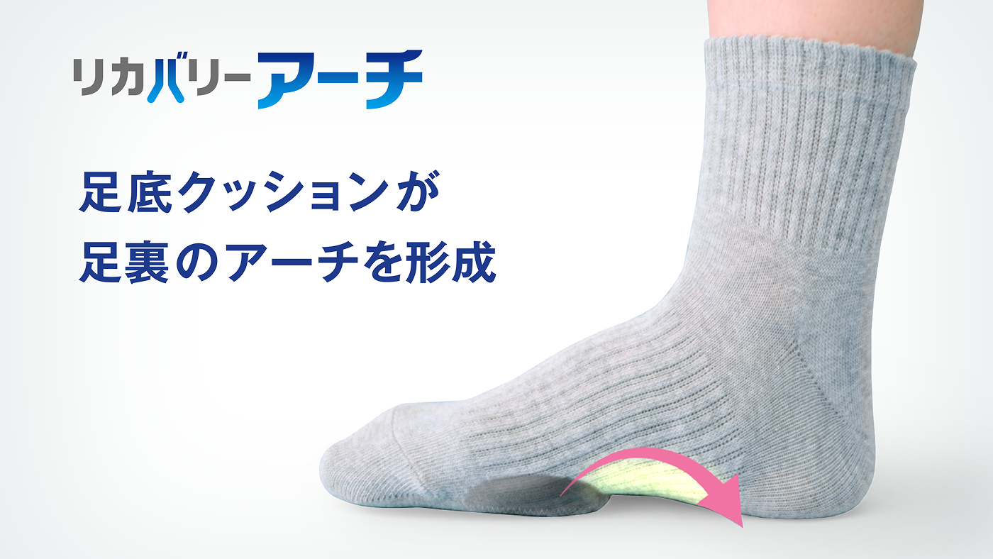 リカバリーアーチは、足裏の指の付け根部分(MP関節)を支える立体3Dクッション構造を採用。