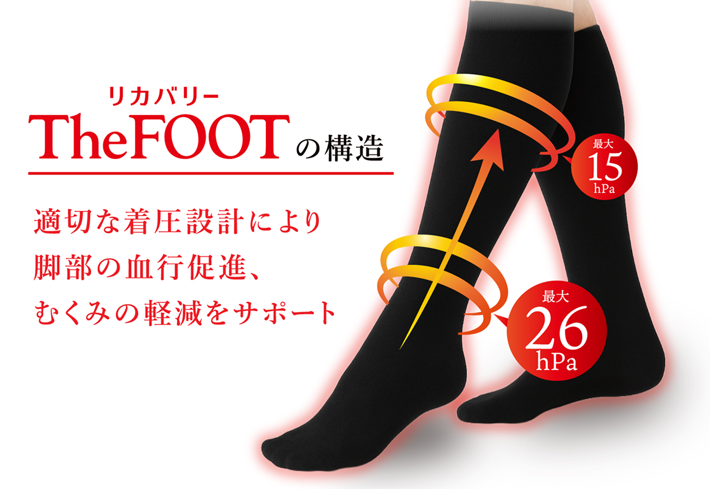 「TheFOOT」は、段階的な着圧設計により脚の血行をサポートする医療機器届出済みの製品です。 むくみ対策や脚のコンディション維持のサポートに、毎日安心してお使い頂けます。